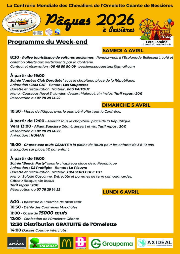 Du samedi 4 au lundi 6 avril, venez célébrer ce grand événement avec la Confrérie Mondiale des Chevaliers de l’Omelette Géante. Un week-end festif, gourmand et convivial à ne pas manquer !