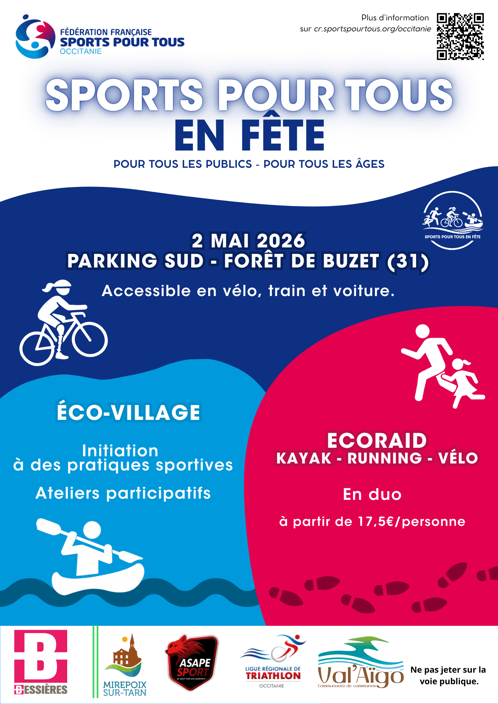 Sports Pour Tous en Fête est un évènement sportif, festif et éco-responsable organisé le 2 mai 2026 dans la Forêt départementale de Buzet. Sur le thème Ça roule, ça flotte, ça plante, Ateliers, initiations, sensibilisation environnementale et temps festifs rythmeront la journée ! Le matin, les participants pourront également prendre part à l’ECORAID, un parcours sportif non […]